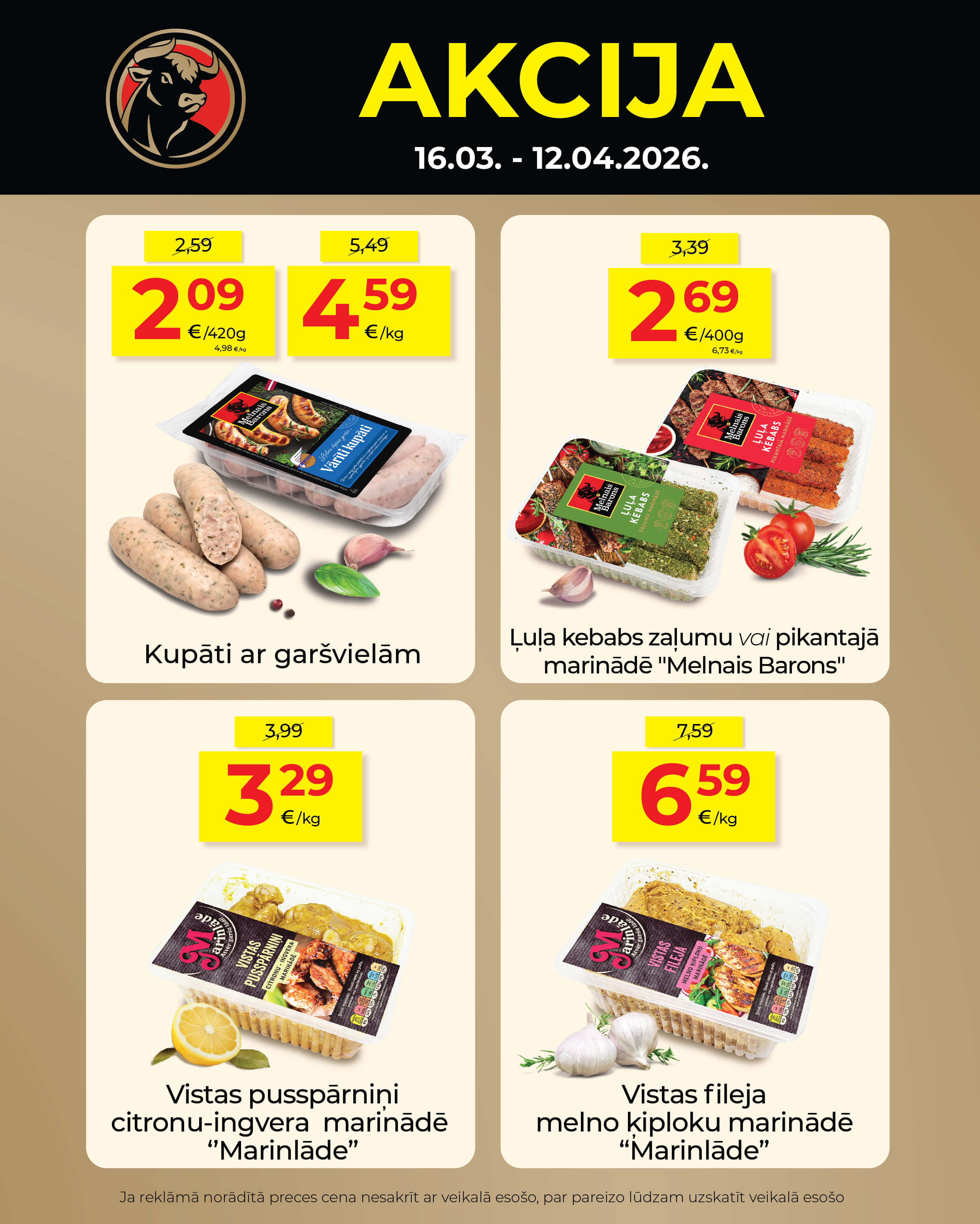 Izmanto izdevīgus piedāvājumus un papildini savu iepirkumu grozu ar kvalitatīviem gaļas izstrādājumiem par īpaši pievilcīgām cenām. Akcijas periodā no 16.03. līdz 12.04.2026. pieejama augstākās kvalitātes salami, kūpināta gaļa, cūkgaļas karbonāde un vistas gaļas rulete.